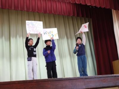 今日の児童集会では、放送委員会と運動委員会による発表が行われました。