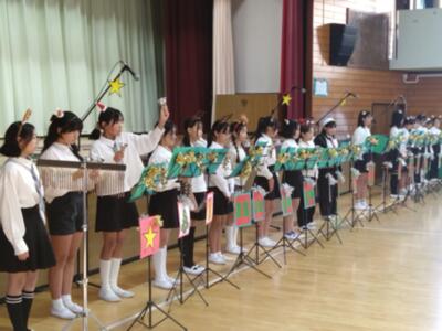 体育館に並んだベルの音色が響き渡り、「ジングルベル」や「あわてんぼうのサンタクロース」など、クリスマスらしい楽しい曲を披露してくれました。一音一音を大切にしながら、仲間と息を合わせて演奏する姿がとても印象的で、会場はあたたかな雰囲気に包まれました。
