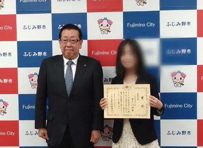 6年生Kさんが「税に関する絵はがきコンクール」で、川越税務署長賞を受賞し、ふじみ野市役所にて市長表敬訪問を行いました。
