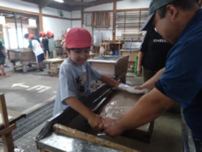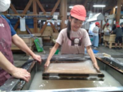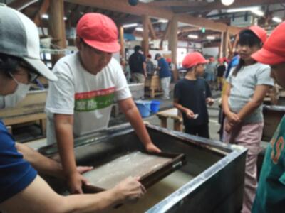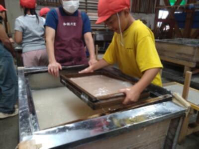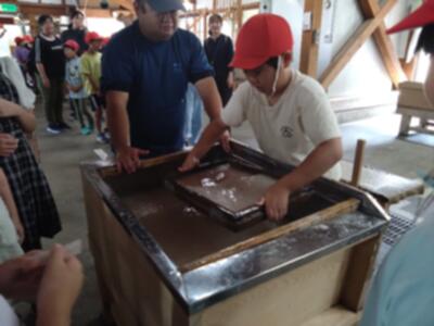 9月30日4年生校外学習③ 投稿: 校長 (13:48) いよいよ校外学習も後半、和紙の里に到着しました。 ここでは、地域の伝統産業を知ることや、和紙づくり体験(すき体験など)を通じて、手仕事の難しさや面白さを実感したりしています。 -